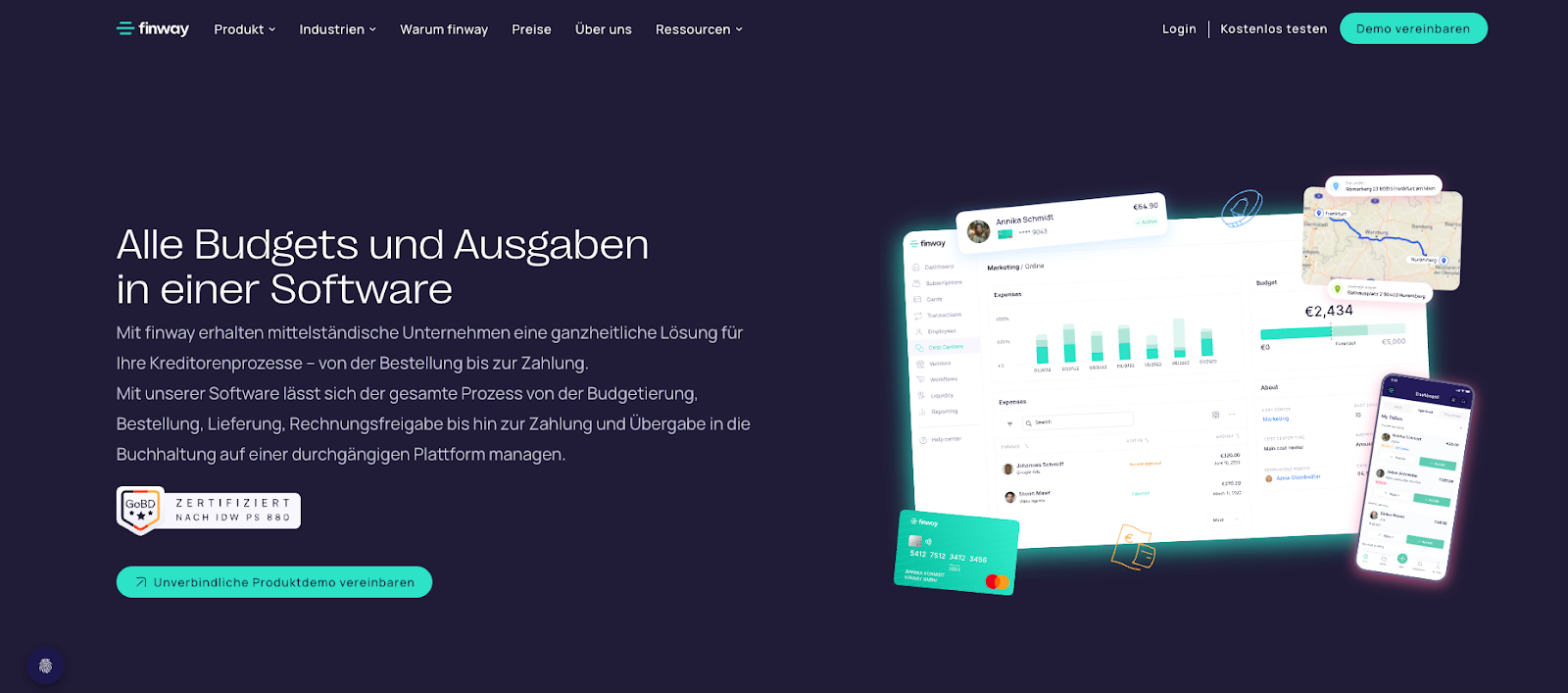 finway wurde 2020 gegründet und ist eine Ausgabenmanagement-Plattform für KMUs, die Rechnungsverarbeitung, Freigabeprozesse, Bankanbindung, virtuelle und physische Karten sowie DATEV-Export in einem Tool vereint. Der Fokus liegt nicht auf Cashflow- und Liquiditätsplanung, sondern auf der Automatisierung operativer Finanzprozesse. finway eignet sich daher als Ergänzung zu einer dedizierten Cashflow-Lösung wie Tidely, nicht als Ersatz.